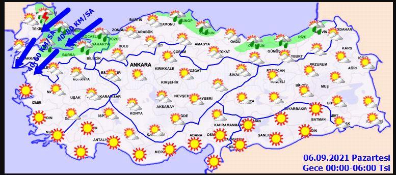Parçalı ve çok bulutlu, bölgenin kuzey ve doğusu ile Çanakkale’nin doğu kesimlerinin yerel sağanak ve gök gürültülü sağanak yağışlı geçeceği tahmin ediliyor. Rüzgarın, kuzey ve kuzeydoğu yönlerden kuvvetli ve yer yer fırtına (40-80 km/sa) şeklinde esmesi bekleniyor.