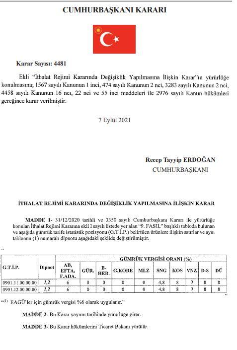 Kararın bir diğer etkisi de kahve ithalatında yaşandı. Avrupa Birliği ülkelerinden ithal edilecek olan kahvelere gümrük vergisi yüzde 11 yerine yüzde 6 olarak uygulanacak.