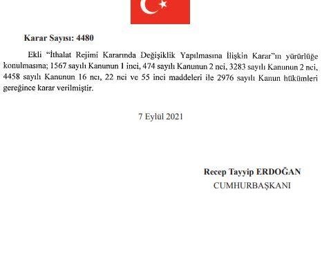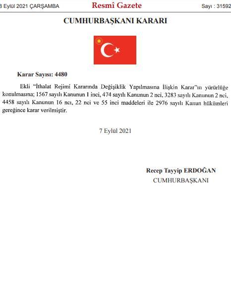 Tarım ürünlerine yönelik olarak yapılan ithalatta gümrük vergisi bazıları için sıfırlandı. Cumhurbaşkanı Recep Tayyip Erdoğan’ın imzasıyla yayımlanan karara göre buğday, çavdar, arpa, yulaf, mısır, nohut, mercimek ithalatı için gümrük vergisi 31 Aralık 2021 tarihine kadar “0” olarak uygulanacak.
