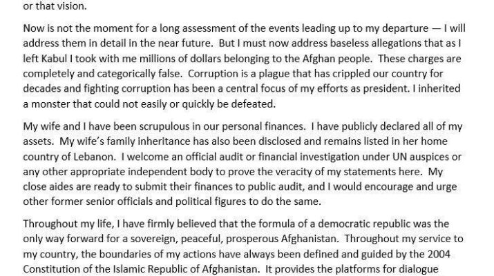 Gani beraberinde Afgan halkına ait olan milyon dolarlarla birlikte kaçtığı iddialarını yalanladı. Eşref Gani, Birleşmiş Milletler’in veya diğer bağımsız denetleme kurumların gözetiminde finansal soruşturmaya açık olduğunu belirtti. Ayrıca Gani, açıklamasında kendi yönetiminin sonunun kendisinden öncekilerle benzer şekilde sonuçlandığı için Afgan halkından özür diledi.