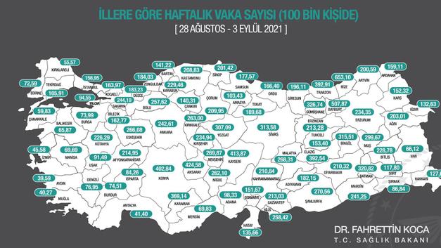 Buna göre, en yüksek vaka oranına sahip üç il, 653,10 ile Rize, 507,874 ile Bayburt ve 424,58 ile Aksaray oldu.