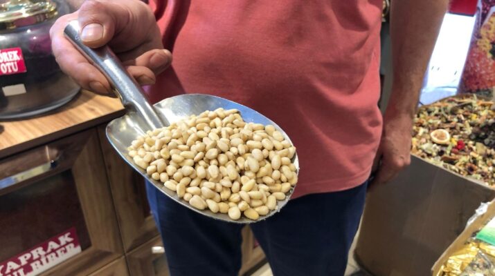 “Çam fıstığının kilosunu şuanda 700 liraya satıyoruz. Yakında daha da artacak. Akdeniz bölgesinde yetişen çam fıstığı orman yangınlarından sonra çok değerlendi. Fiyatı ilerleyen günlerde çeyrek altınla yarışacak. Yanan ağaçların yerine gelmesi uzun yıllar alacağı için fiyatının daha da artacağını düşünüyoruz. Normalde irmik helvası, sarma, pilav, hindi dolma gibi yemeklerde kullanılıyor. Protein ve mineral bakımından çok yüksek değerleri var. Fakat insanlar fiyatından dolayı kullanamıyor ve alternatif arıyor.”