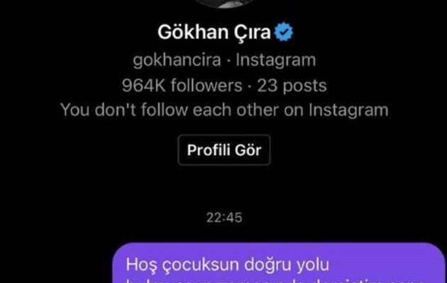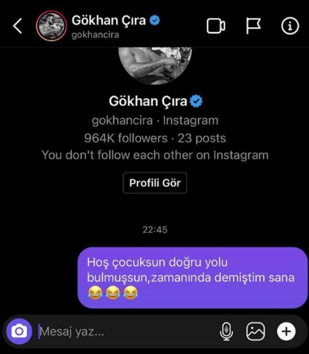 Özlem Parlu, Gökhan Çıra, “Hoş çocuksun doğru yolu bulmuşsun, zamanında demiştim sana” diye mesaj attı ve bu mesajın fotoğrafını sosyal medyada yayınladı.
