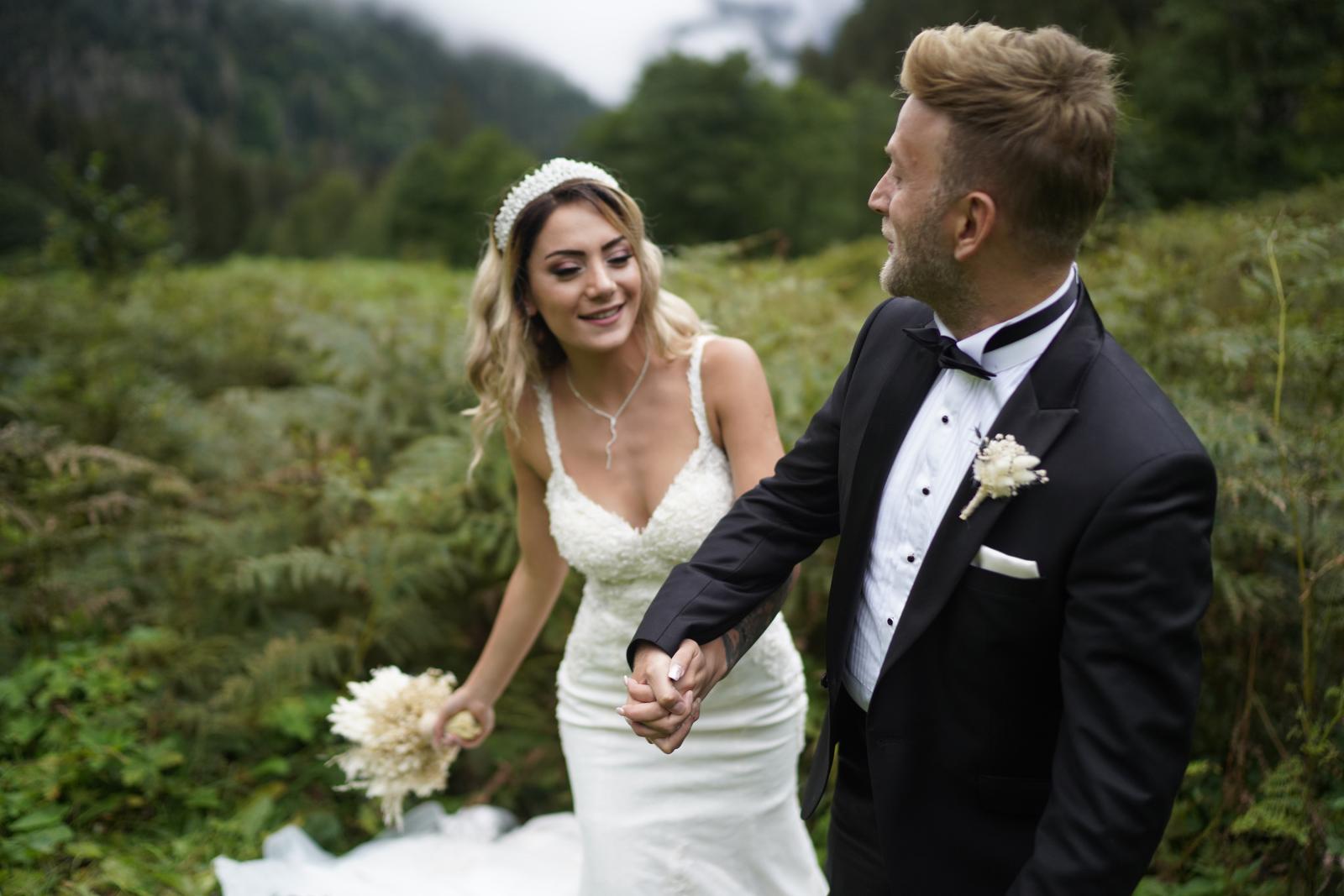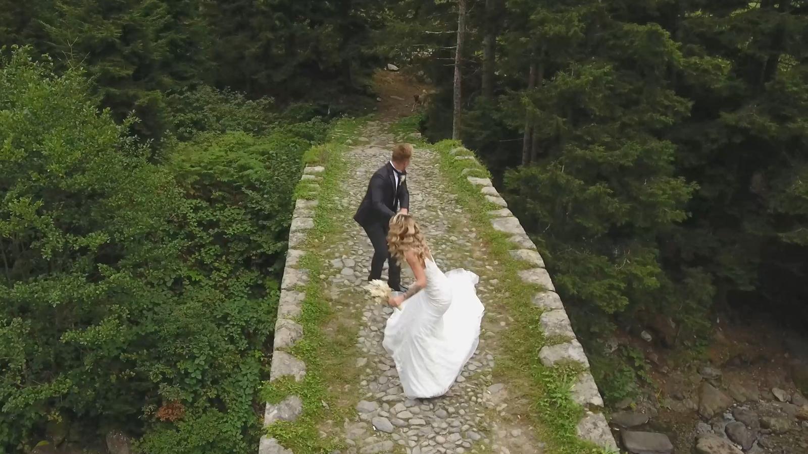 Karadenizli müzisyen Çağlar Paliç ile Beyza Şimşek, Çamlıhemşin ilçesinde doğada düğün fotoğrafları çektirdi. Çat Kemer Köprüsü’ne çıkan çift, görüntü alan drona poz verdi. Bu sırada dron sesinden ürken çoban köpeği, köprüdeki çiftin üzerine doğru koşmaya başladı.