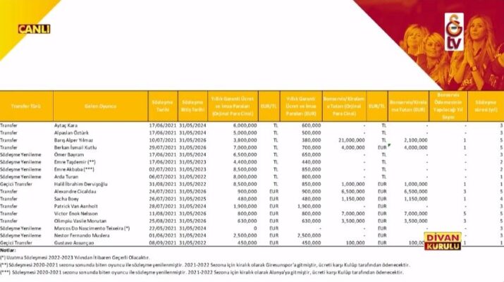 Elmas, sarı-kırmızılı ekibin bu sezon gerçekleştirdiği transferlerin mali detaylarını paylaştı. Önemli bir transfer sezonunu geride bıraktıklarını söyleyen Elmas, “Galatasaray’ın bir senelik yönetimin takdiri için herkesi mutlu edecek transferleri yapma lüksü yok. Burada cesaret göstererek, ince eletip sık dokuyarak, bir dönemlik değil, 4 senelik bir sistem uygulamak gerekiyordu. Biz ve teknik direktörümüz bir anlaşmayla büyük bir cesaret gösterdik. Belki de Galatasaray’da ilk defa gerçekleştirişmiş bir strateji ile transfer dönemini geçirdik. Çok eleştiriler geldi. Diğer rakiplerimiz hiçbir detay paylaşmıyor. Biz finansal disiplinden ödün vermeyeceğiz” diye konuştu.