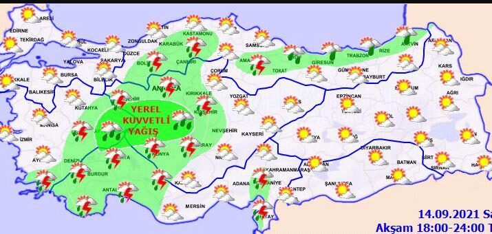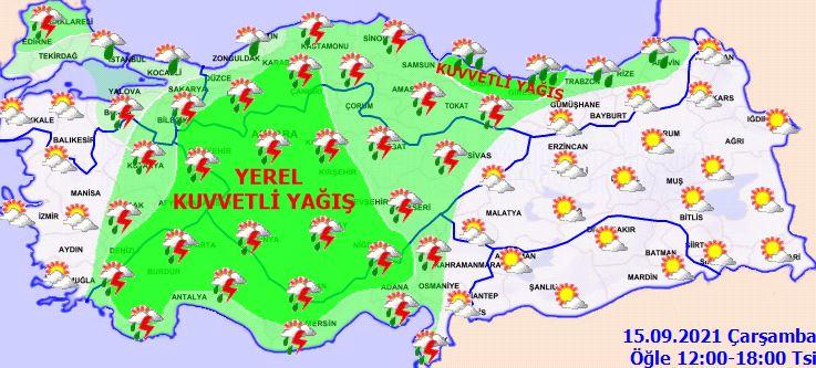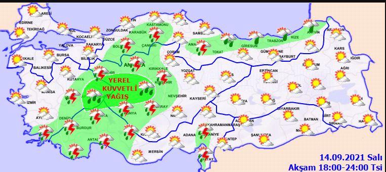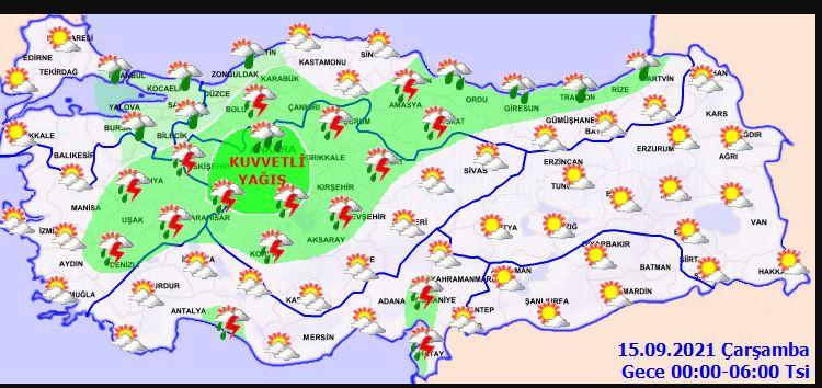 Meteoroloji Genel Müdürlüğü tarafından yapılan son değerlendirmelere göre: Ülkemiz genelinin parçalı ve yer yer çok bulutlu, Marmara’nın kuzey ve doğusu, İç Ege, Akdeniz, İç Anadolu, Batı ve Orta Karadeniz, Doğu Karadeniz kıyıları ile Muğla çevrelerinin sağanak ve gök gürültülü sağanak yağışlı geçeceği tahmin ediliyor. Yağışların, Göller Yöresi, İç Anadolu’nun güney ve batısı, Bolu, Karabük, Ordu ve Giresun çevreleri ile Samsun’un doğusunda yerel kuvvetli olması bekleniyor.