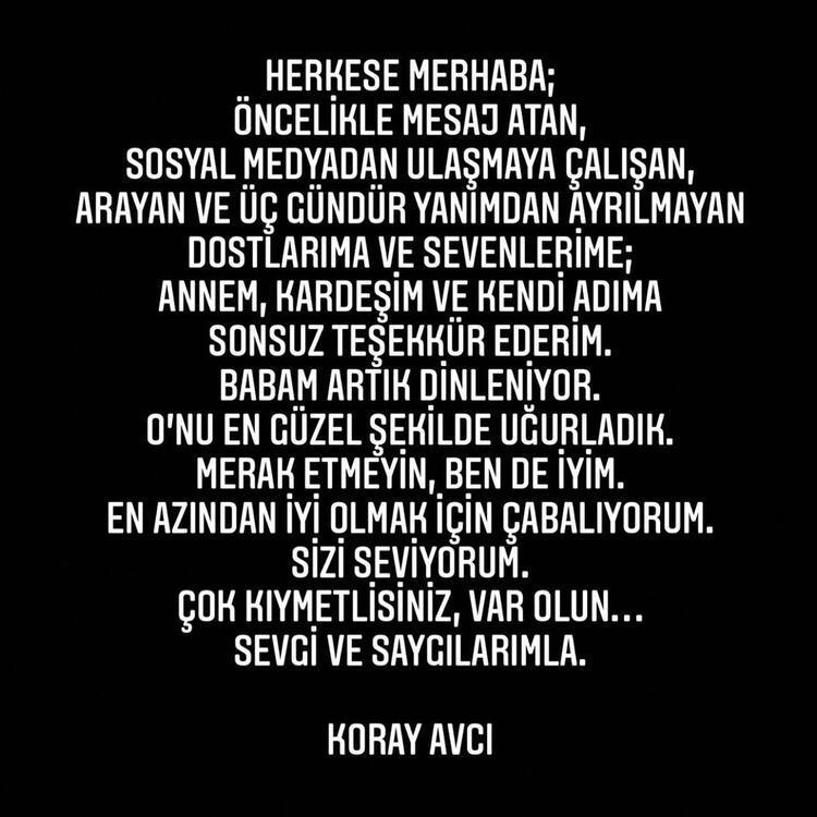Üç gün önce babası Veysel Medet Avcı’yı kaybeden Koray Avcı, zor günleri atlatmaya çalışıyor. Avcı, cenaze sürecinde kendisini yalnız bırakmayanlara sosyal medya hesabından teşekkür etti.