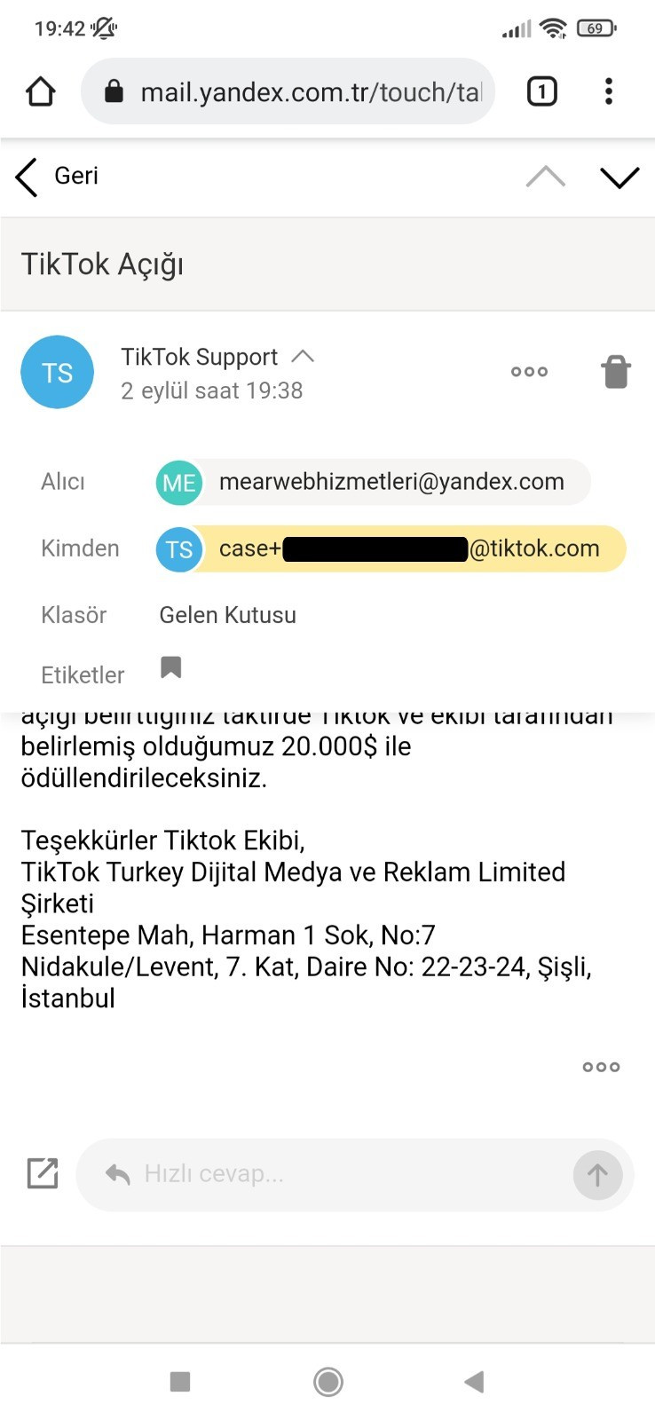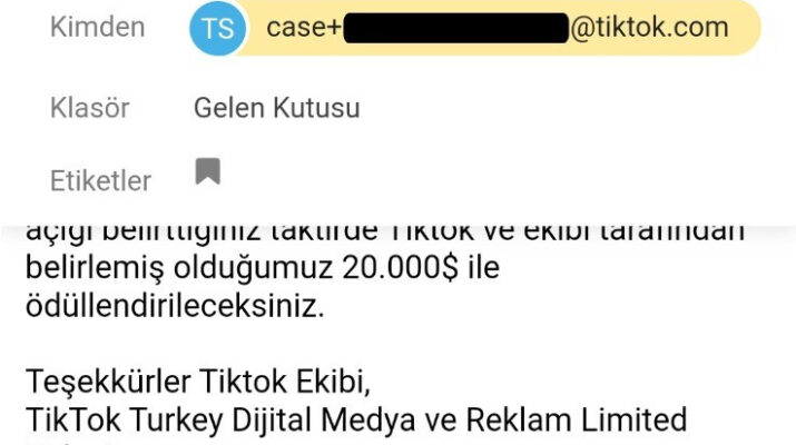 Konuyla ilgili gençlere ulaşan TikTok, 20 bin dolar ödül teklif etti. Ödülü mail yoluyla aldıklarını anlatan Mert Ergün (18) bu teklifi reddettiklerini söyledi. Ergün, “Daha önce Türkiye’den muhatap bulamamıştık. Şimdi bize ulaştılar. 20 bin dolar teklif ettiler ama kabul etmedik” dedi.