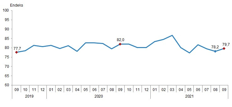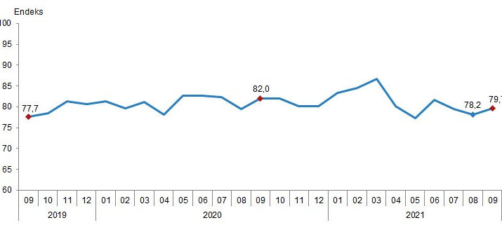 Tüketici Güven Endeksi, Eylül ayında bir önceki aya göre yüzde 1,8 oranında arttı; Ağustos ayında 78,2 olan endeks, Eylül ayında 79,7 oldu.