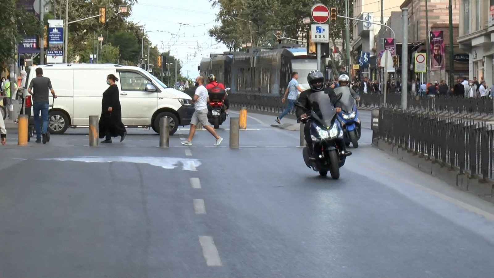 Tarihi Yarımada’nın işlek caddelerinden ve turistlerin uğrak yeri olan Fatih Ordu Caddesi ve çevresindeki sokaklar 10.00-21.00 saatleri arasında araç trafiğine kapatıldı. Caddeyi kullanmayı sürdüren motosiklet sürücüleri zaman zaman hızlarını arttırıyor. Motosiklet sürücüleri, belli bir şeride uymayarak, kazaya davetiye çıkarıyor. Caddede dün bir motosiklet, el arabasıyla çalışan bir kişiye çarptı. Kazada motosiklet sürücüsü ile el arabalı kişi yaralanırken, kaza anı güvenlik kamerasına saniye saniye yansıdı. Esnaf ise bu duruma bir çözüm bulunmasını istiyor.