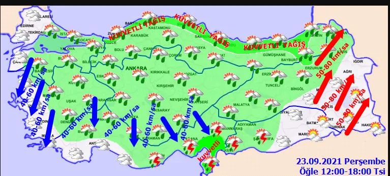 Rüzgarın, Marmara’nın güneybatısı, Kuzey Ege kıyıları, Güney ve İç Ege ile Akdeniz’in iç kesimlerinde kuzey yönlerden kuvvetli (40-60 km/sa), Doğu Anadolu’nun doğusunda güney ve güneybatı yönlerden kuvvetli ve yer yer fırtına şeklinde (50-80 km/sa) eseceği tahmin edildiğinden, ağaç ve direk devrilmesi, çatı uçması ve ulaşımda aksamalar gibi olumsuzluklara karşı dikkatli ve tedbirli olunması gerekmektedir.