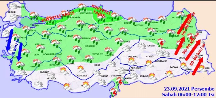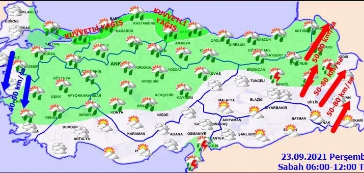 Meteoroloji Genel Müdürlüğü tarafından yapılan son değerlendirmelere göre: Ülkemiz genelinin parçalı ve yer yer çok bulutlu, Marmara, Ege (Muğla hariç), Batı Akdeniz’in iç kesimleri, Doğu Akdeniz, İç Anadolu, Karadeniz, Doğu Anadolu’nun kuzey ve batısı, Güneydoğu Anadolu’nun batısı ile Siirt çevrelerinin yerel olmak üzere aralıklı sağanak ve gök gürültülü sağanak yağışlı geçeceği tahmin ediliyor. Yağışların: Karadeniz kıyıları, İstanbul, Kocaeli, Sakarya, Kastamonu, Hatay, Osmaniye, Erzurum, Ardahan ve Bingöl çevreleri ile Adana’nın doğu kesimlerinde yerel olarak kuvvetli olması bekleniyor. Rüzgarın, Marmara’nın güneybatısı, Kuzey Ege kıyıları, Güney ve İç Ege ile Akdeniz’in iç kesimlerinde kuzey yönlerden kuvvetli (40-60 km/sa), Doğu Anadolu’nun doğusunda güney ve güneybatı yönlerden kuvvetli ve yer yer fırtına şeklinde (50-80 km/sa) eseceği tahmin ediliyor.