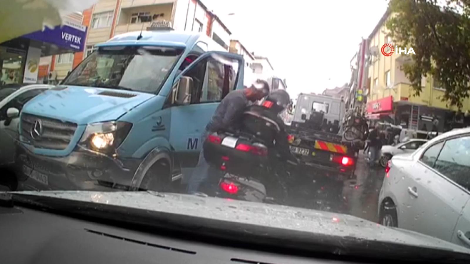 Dudullu hattında çalışan bir hatlı minibüs şoförü seyir halindeyken, sıkışan yolda motosiklet sürücüsü ile tartışmaya başladı. Tartışmanın büyümesi ile öfkelenen minibüs şoförü aracından inerek kasklı motosiklet sürücüsüne kafa attı. Minibüsçünün, karşısındaki kişinin kafasındaki kaskına kafa atması ilginç anlara sahne oldu. Olay yerine gelen polis ekipleri, tartışan sürücüleri ayırdı.