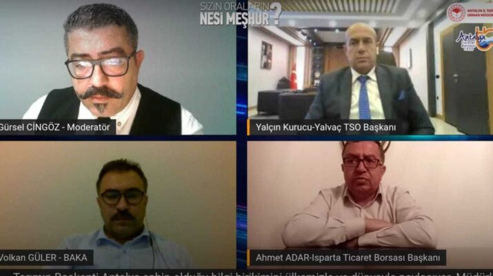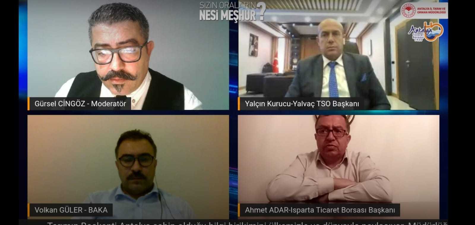 Antalya Ticaret Borsası (ATB) ile Antalya Tarım ve Orman Müdürlüğü işbirliğinde, yöresel ürünleri gündeme getirmek amacıyla düzenlenen “Sizin Oraların Nesi Meşhur?” programının bu haftaki konuğu Isparta oldu. Moderatörlüğünü Gürsel Cingöz’ün yaptığı programa, Isparta Ticaret Borsası Başkanı Ahmet Adar, Batı Akdeniz Kalkınma Ajansı (BAKA) Genel Sekreteri Volkan Güler, Yalvaç Ticaret ve Sanayi Odası Başkanı Yalçın Kurucu konuk olarak katıldı.