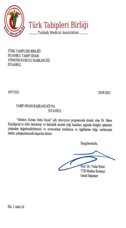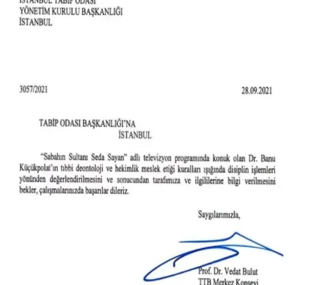 “Sabahın Sultanı Seda Sayan” adlı televizyon programında konuk olan Op. Dr. Banu Küçükpolat’ın tıbbi deontoloji ve hekimlik meslek etiği kuralları ışığında disiplin işlemleri yönünden değerlendirilmesini ve sonucundan tarafımıza ve ilgililerine bilgi verilmesini bekleriz.”
