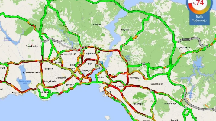İstanbul Büyükşehir Belediyesi Trafik Yoğunluk Haritasına göre saat 16.30 itibarıyla kentteki trafik yoğunluğu yüzde 74 olarak ölçüldü.