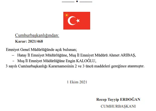 Buna göre Hatay Emniyet Müdürlüğüne Muş Emniyet Müdürü Ahmet Arıbaş atandı. Ahmet Arıbaş İçişleri Bakanlığının 27.12.2018 tarihli kararnamesi ile Muş İl Emniyet Müdürü olarak atanmıştı.
