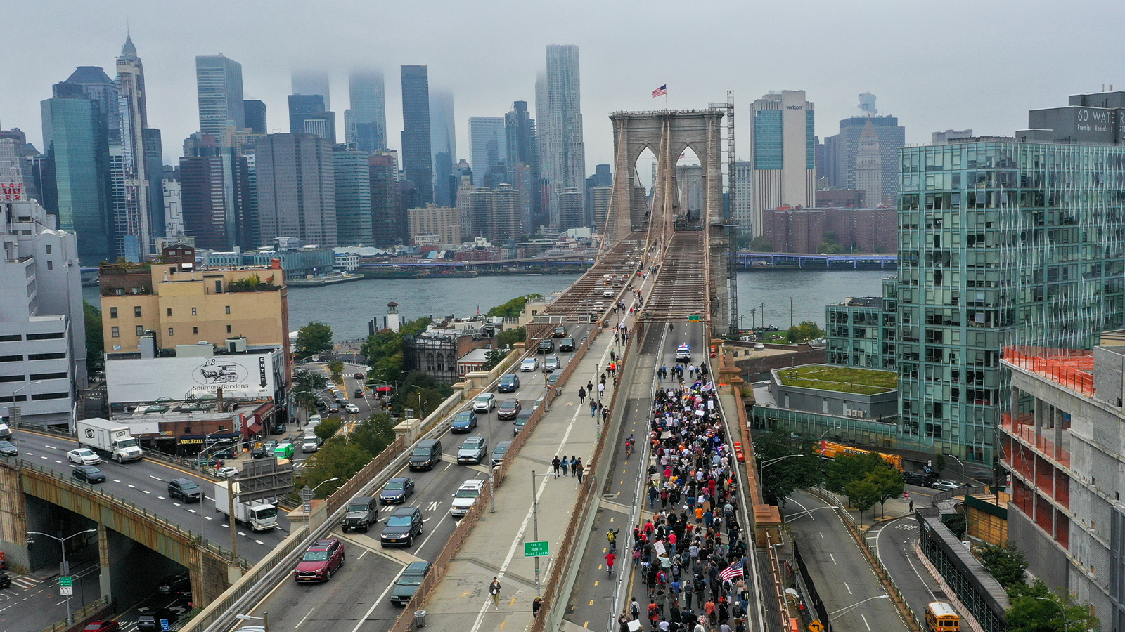 Brooklyn Köprüsü üzerinden yürüyüşe geçen ABD ve Avustralya bayrakları ile pankart taşıyan göstericiler aşı karşıtı sloganlar attı.