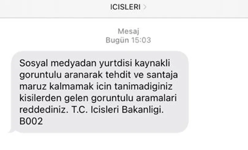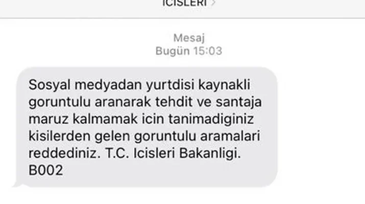 Bir uyarı da İçişleri Bakanlığı’ndan geldi. Bakanlık tarafından cep telefonlarına gönderilen kısa mesajda “Sosyal medyadan yurt dışı kaynaklı görüntülü aranarak tehdit şantaja maruz kalmamak için tanımadığınız kişilerden gelen görüntülü aramaları reddediniz” denildi.
