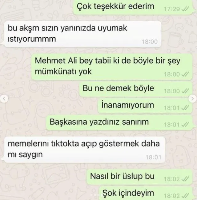 Ronay açıklamasıyla birlikte 64 yaşındaki şovmenin kendisine attığı mesajları da yayınladı. Erbil’in mesajlarında “Bu akşam yanınızda uyumak istiyorum. Memelerini Tiktok’ta açıp göstermek daha mı saygın” gibi cümleler vardı.