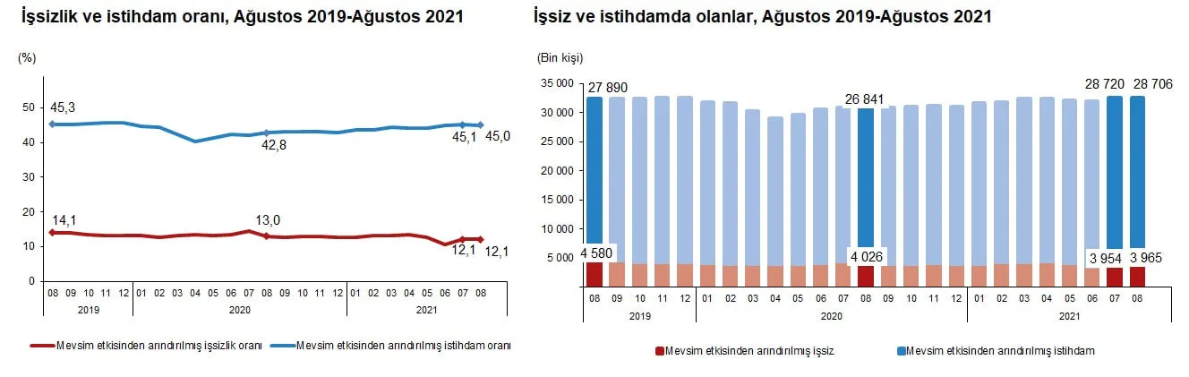 Türkiye genelinde 15 ve daha yukarı yaştaki kişilerde işsiz sayısı 2021 yılı Ağustos ayında bir önceki aya göre 11 bin kişi artarak 3 milyon 965 bin kişi oldu. İşsizlik oranı ise değişim göstermeyerek yüzde 12,1 seviyesinde gerçekleşti.