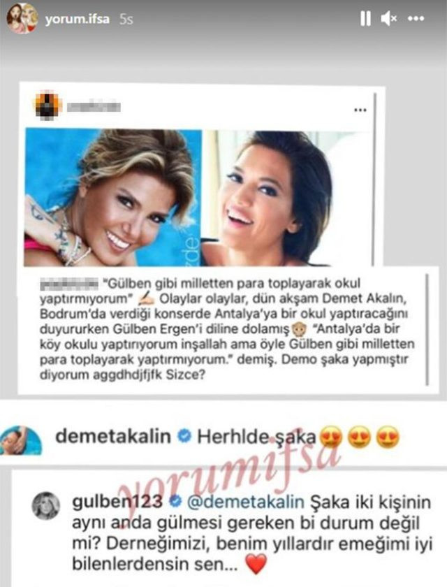 Demet Akalın, sosyal medyada bir magazin hesabının yayınladığı, “Demet Akalın, Gülben Ergen’i diline dolamış. Demo şaka yapmıştır. Sizce?” mesajına yorum yazdı. Ünlü şarkıcı, söz konusu paylaşımın altına “Herhalde şaka” yorumunda bulundu. Gülben Ergen ise Akalın’ın ‘şaka’ savunmasına dikkat çeken bir cevap verdi.