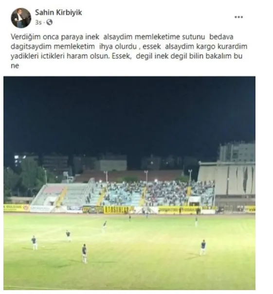 TFF 2. Lig’de mücadele eden Tarsus İdman Yurdu’nda kulüp başkanı Şahin Kırbıyık, sosyal medyadan “Verdiğim onca paraya inek alsaydım, memleketime sütünü bedava dağıtsaydım, memleketim ihya olurdu. Eşek alsaydım kargo kurardım! Yedikleri-içtikleri haram olsun! Eşek değil, inek değil, bilin bakalım bu ne?” paylaşımını yaptı.