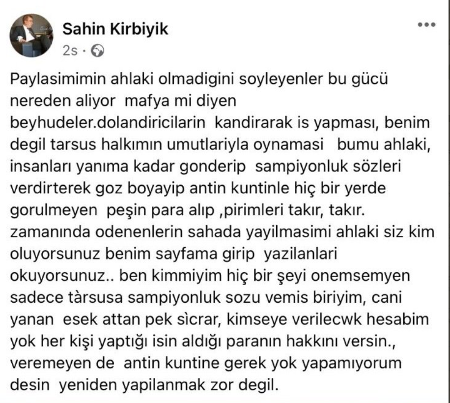 Tarsus İdman Yurdu Başkanı Şahin Kırbıyık tepkilerin ardından yeni bir paylaşım yaptı: