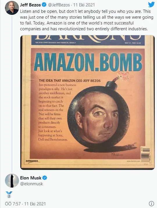 Musk’ın daha önce Forbes‘a gönderdiği bir e-posta gündem olmuştu. Buna göre, Tesla CEO’su, Bezos’a gümüş madalya ve iki rakamlı dev bir heykel göndereceğini ileri sürdü. Bunu henüz gerçekleştirmese de benzer bir adımı Twitter’da attı.