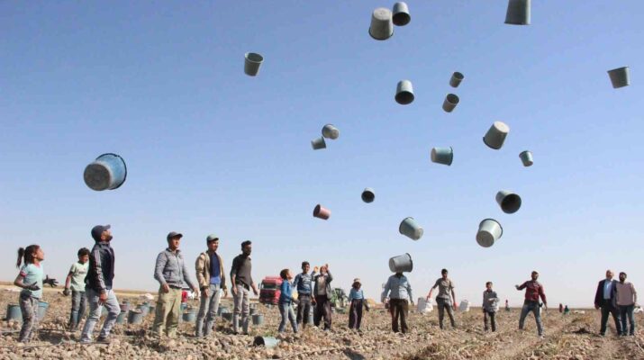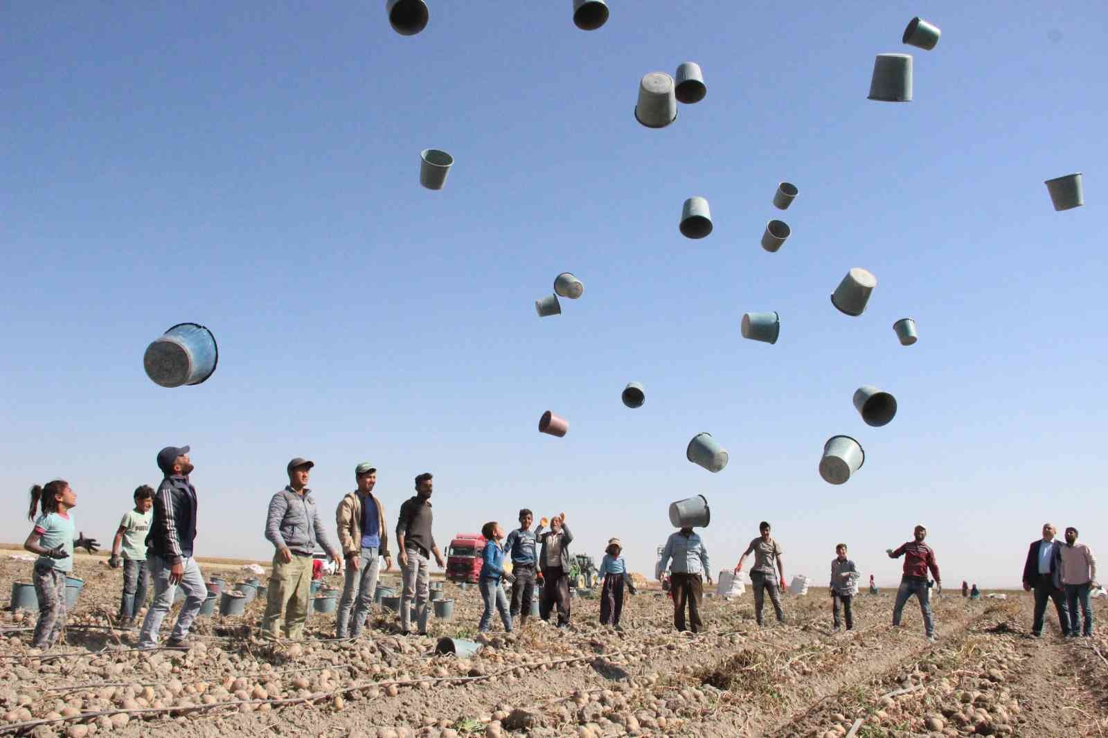 Karaman’da ekimi yapılan cipslik patatesin hasadı, işçilerin patatesleri topladıkları kovaları havaya fırlatmasıyla başladı.
