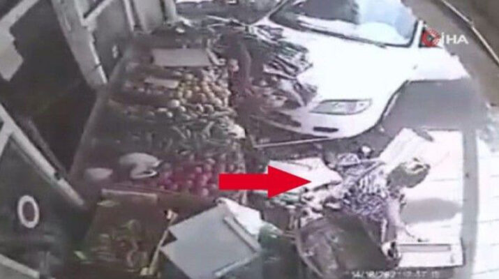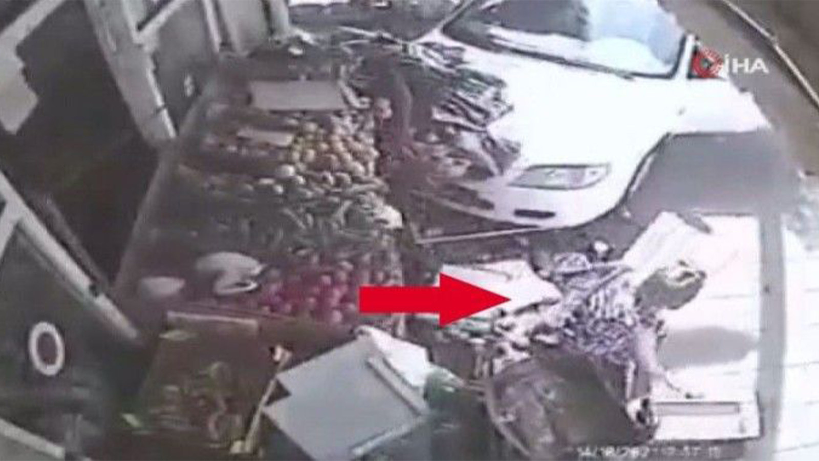 Aşırı hız nedeniyle kontrolden çıkan bir araç manava dalarak, o sırada manavda bulunan bir kadına hafifçe çarptı. Kadın yere düşmesine rağmen ayağa kalkıp hiçbir şey olmamış gibi alışverişe devam etti.