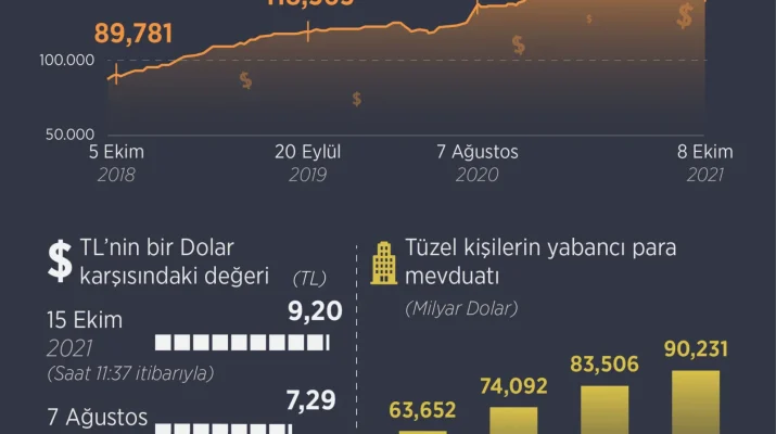 31 Aralık 2020 tarihinde dolar/TL kuru 7,43 seviyesinden işlem görürken 8 Ekim 2021 tarihinde dolar/TL güne 8,87 civarından başlamıştı. Yani kurun seviyesinin iki tarih arasında farkına rağmen vatandaşın hesaplarındaki dolar miktarının düşüşü göze çarpıyor.