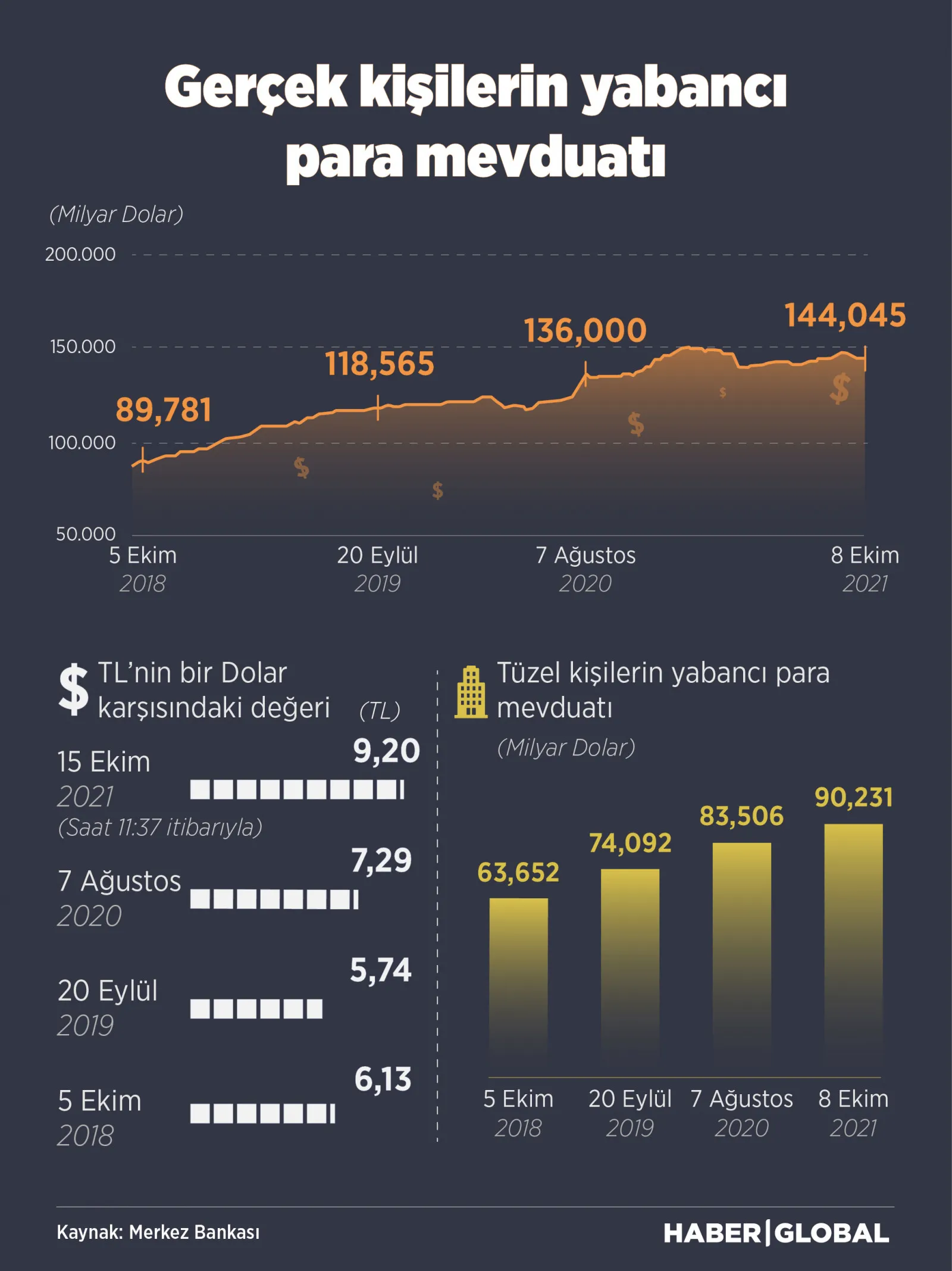 2018 Ağustos kur hareketinin ardından vatandaşın dövize olan ciddi talebinin de dolar/TL kurunu yukarıda tuttuğu görülmüştü. Ancak bu seferki harekette durumun böyle olmadığı gözlendi. Merkez Bankası’nın her hafta Perşembe günü yayımladığı Banka ve Para İstatistikleri’ne göre 31 Aralık 2020 tarihinde Türkiye’de yaşayan ‘gerçek kişilerin’ hesaplarında 68 milyar 970 milyon ABD doları bulunuyordu. 8 Ekim 2021 ile biten haftada bu miktar 66 milyar 488 milyar dolara indi.