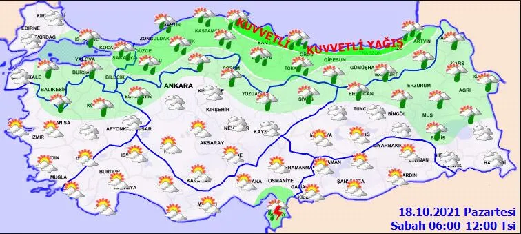 Yağışların; Orta ve Doğu Karadeniz kıyıları ile Sinop çevrelerinde yerel olarak kuvvetli olması bekleniyor. Ani sel, su baskını, yıldırım, dolu yağışı, yerel kuvvetli rüzgar ve fırtına ile ulaşımda aksamalar gibi olumsuzluklara karşı vatandaşlar uyarıldı.
