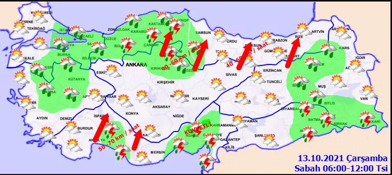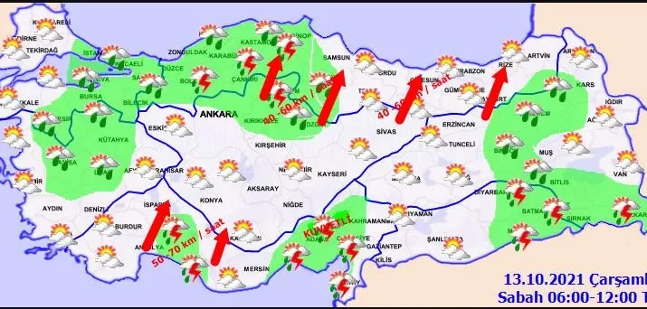 Meteoroloji Genel Müdürlüğü tarafından yapılan son değerlendirmelere göre: Marmara’nın doğusu, Karadeniz, İç Anadolu’nun kuzeyi, Doğu Akdeniz, Doğu Anadolu’nun kuzey ve doğusu ile Kütahya, Kilis ve Siirt çevrelerinin sağanak ve gök gürültülü sağanak yağışlı geçeceği tahmin ediliyor. Yağışların; Orta ve Doğu Karadeniz kıyıları ile Sinop çevrelerinde yerel olarak kuvvetli olması bekleniyor.