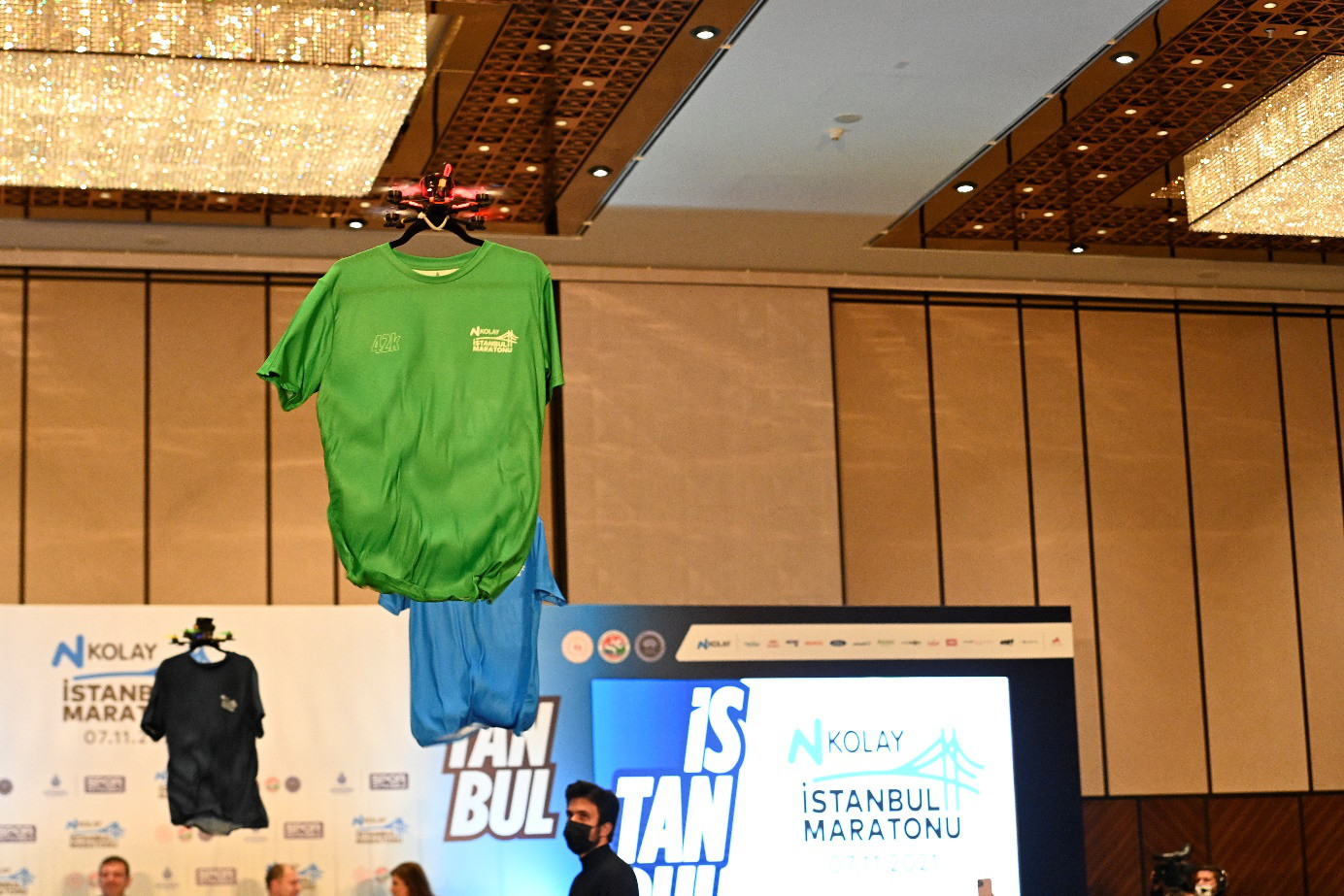 N Kolay 43. İstanbul Maratonu için özel olarak tasarlanan tişörtler basın toplantısında yarış ‘drone’larıyla tanıtıldı. Salon içinde yapılan bu drone gösterisi büyük beğeni ve alkış topladı.