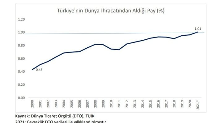 Ticaret Bakanı Mehmet Muş, sosyal medya hesabından yaptığı paylaşımda, artık Türk ürünlerinin dünyanın dört bir yanına ihraç edildiğini belirterek, “Türkiye’nin dünya ihracatından aldığı pay Cumhuriyet tarihinde ilk kez yüzde 1’in üzerine çıktı. Bu rakam; 1980’de yüzde 0.14, 2000’de yüzde 0.43 idi. Bu başarı Türkiye’nin” dedi.