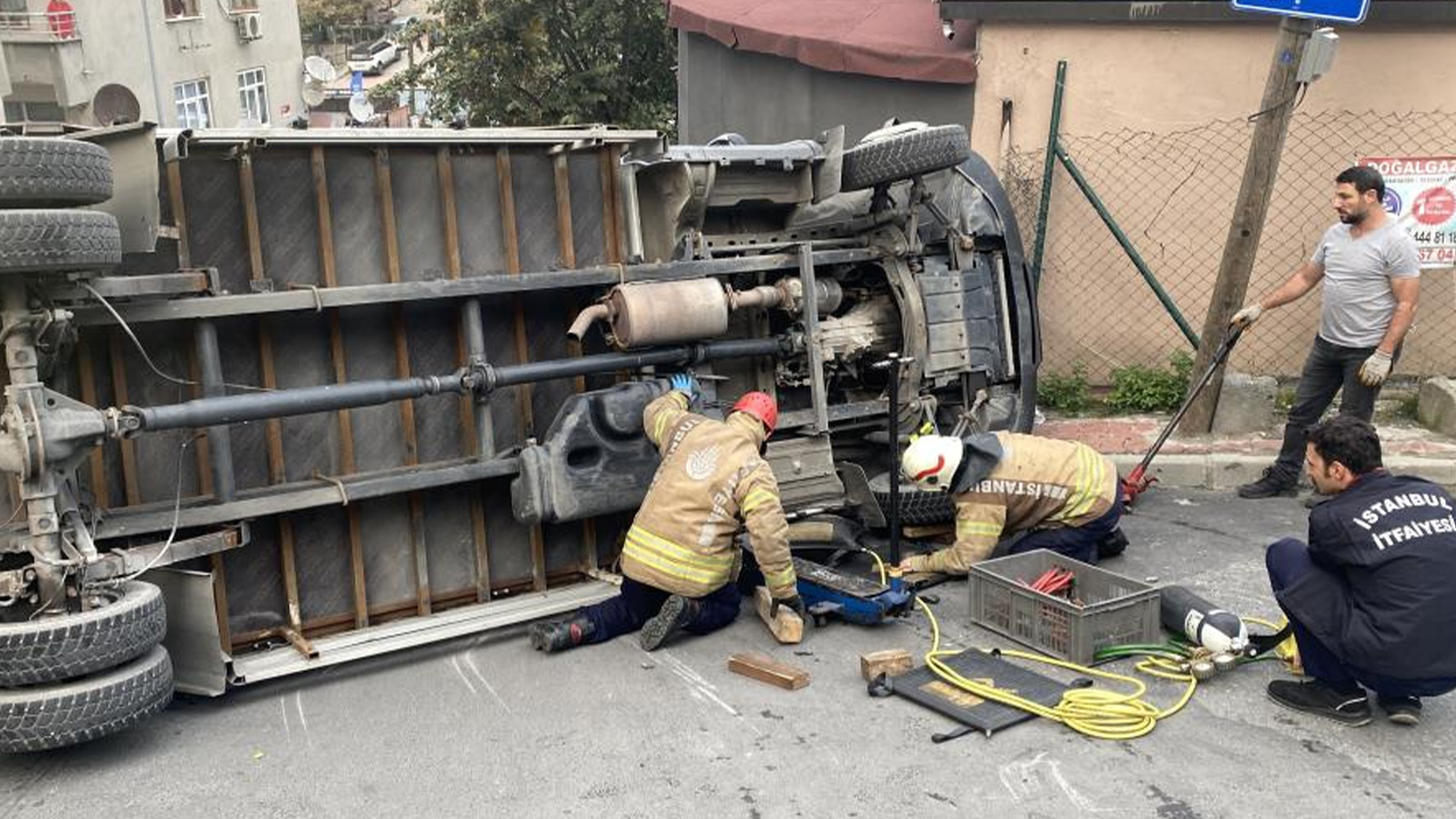 Kamyonetin ön camını kıran vatandaşlar sıkışan sürücüyü çıkartmak istedi ancak başarılı olamadı. Kısa sürede olay yerine gelen itfaiye ekipleri, sürücüyü kurtarmak için çalışmalara başladı. Çalışmalar esnasında bir vatandaş sıkışan sürücüyü sakinleştirmeye çalışarak su verdi. İtfaiye ekiplerinin yaklaşık yarım saat süren çalışmasının ardından sürücü sıkıştığını yerden kurtarılarak sedyeye alındı. Can pazarı ise kameralara yansıdı.