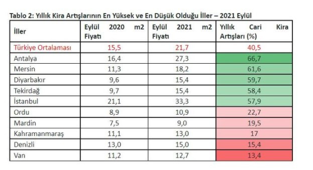 Eylül’de kiralık ilan m2 fiyatı yıllık artış oranı üç büyük ilde de yükseldi. Yıllık kira artış oranı geçen aya göre İstanbul’da 7,2 puan, Ankara’da 9,5 puan ve İzmir’de 6,6 puan artarak İstanbul’da yüzde 57,9, Ankara’da yüzde 41,2 ve İzmir’de yüzde 37,5 oldu. Böylece 2020 Eylül’de İstanbul’da 21,1 TL, Ankara’da 11,5 TL ve İzmir’de 16,7 TL olan ortalama kiralık konut ilan m2 fiyatları, 2021 Eylül’de bu illerde sırasıyla 33,3 TL’ye, 16,3 TL’ye ve 22,9 TL’ye yükseldi.