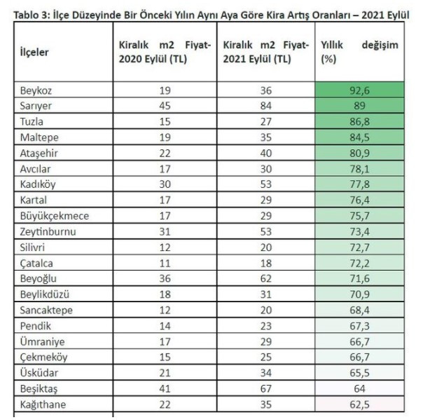 Bu yılın Nisan ayından itibaren İstanbul’un genelinde gözlemlenen yüksek kira artışının ilçeler düzeyinde çok farklı bir seyir izlediği görüldü. En yüksek kira artış oranı görülen ilçe Beykoz (yüzde 92,6) olurken, sırasıyla, Sarıyer (yüzde 89), Tuzla (86,8), Maltepe (yüzde 84,5) ve Ataşehir (yüzde 80,9) en yüksek kira artışları ölçülen ilçeler oldu. En düşük kira artış oranı Bayrampaşa’da (yüzde 27,6) hesaplanırken, sırasıyla, Eyüpsultan (yüzde 33,3), Esenler (yüzde 33,7), Güngören (yüzde 38,9) ve Fatih (yüzde 42,9) en düşük kira artışlarının görüldüğü ilçeler oldu. Eylül 2021 itibarıyla ortalama m2 fiyatının en yüksek olduğu üç ilçe sırasıyla Sarıyer, Beşiktaş ve Beyoğlu olurken, en düşük m2 fiyat ise Sultanbeyli, Çatalca ve Arnavutköy ilçelerinde gözlemlendi.