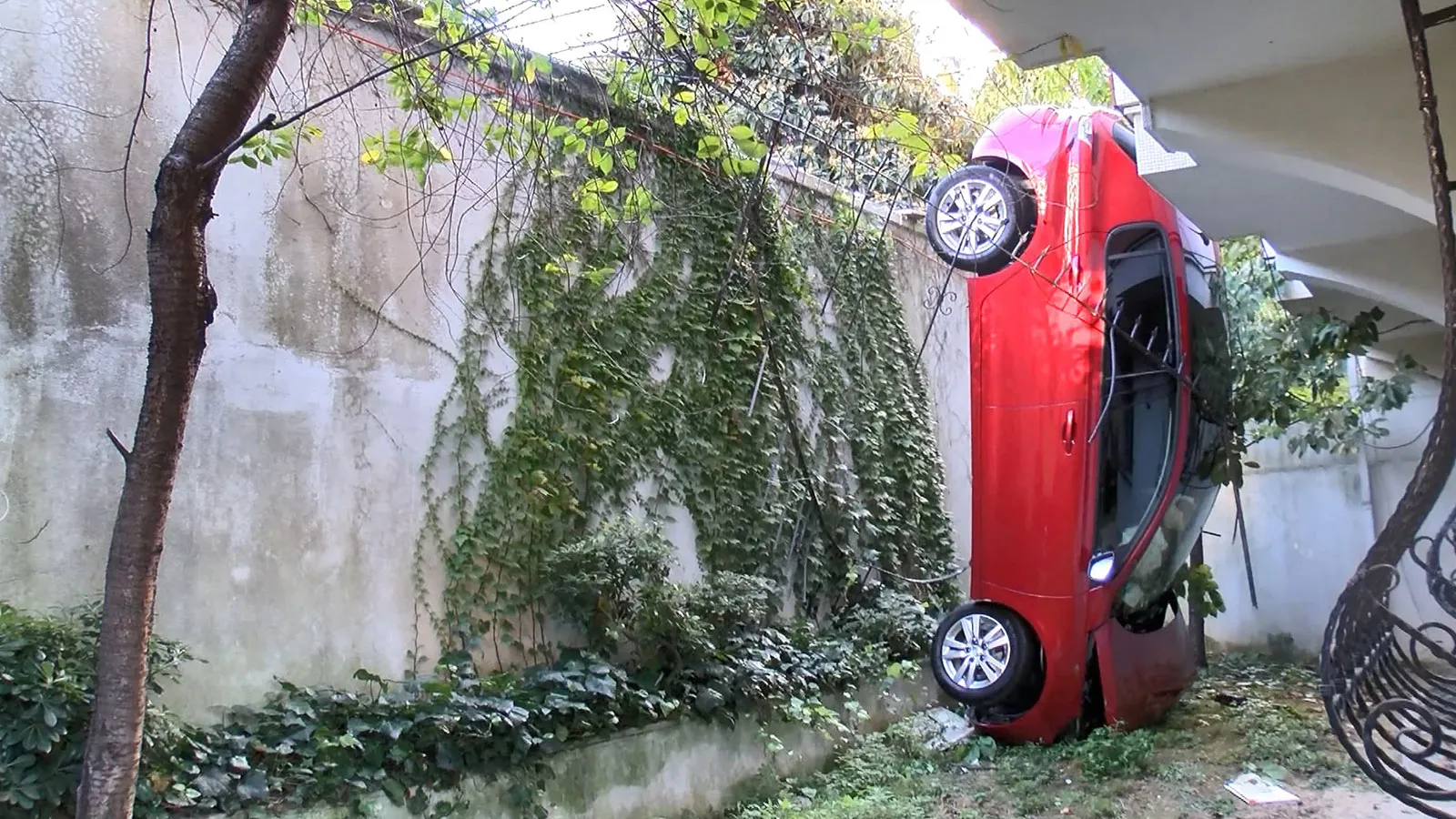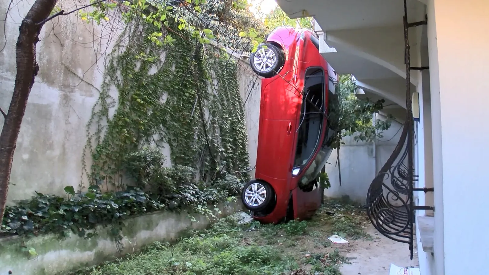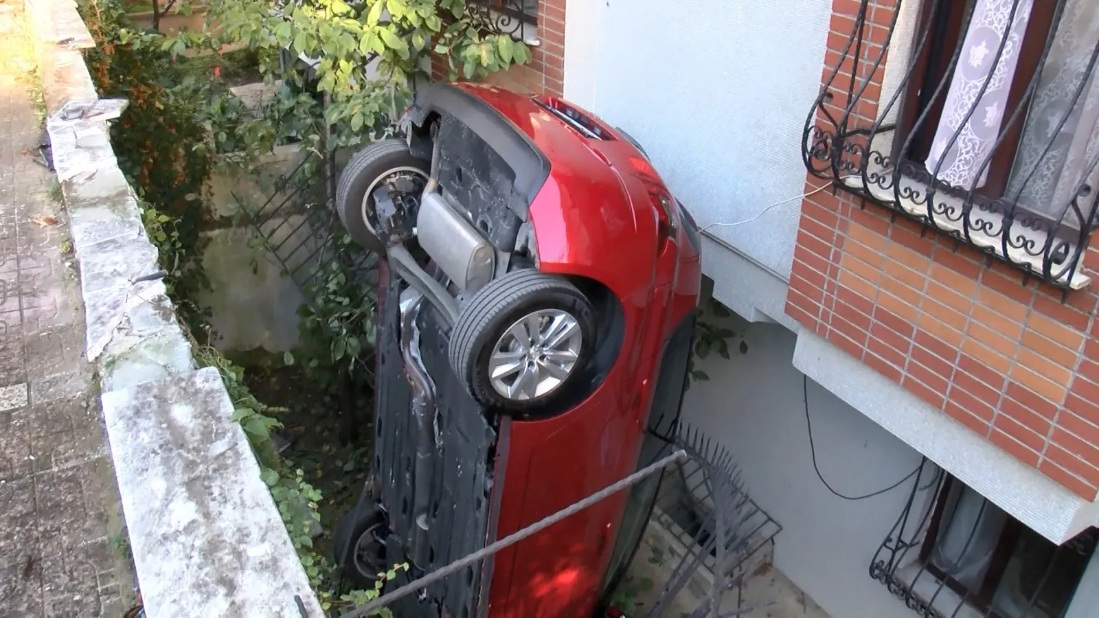 Sürücü, sokaktan çıkabilmek için manevra yapabilmek için apartmanın otoparkına girdi. Bu sırada fren yerine gaza basan sürücü, otomobili ile istinat duvarı üzerindeki demir korkulukları aşarak, apartmanın bahçesine düştü.