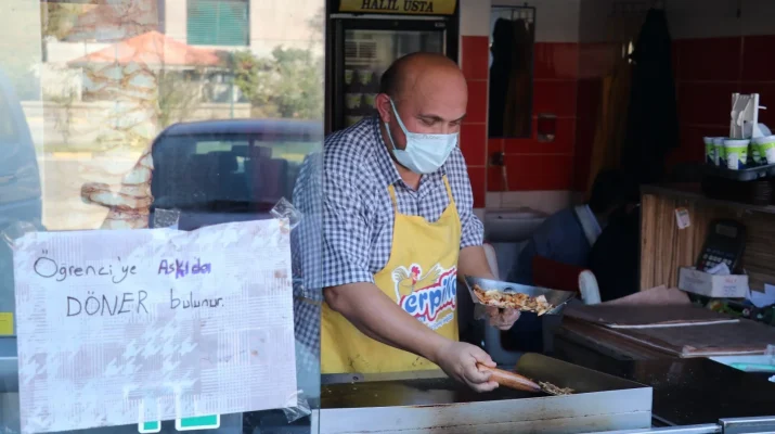 Karabük’te isminin açıklanmasını istemeyen bir hayırseverin ölen babası için başlattığı ‘Askıda Döner’ uygulaması bir başka hayırsever tarafından devam ettiriliyor. Hayırseverden ücretini alan dönerci, dükkanının camına “Öğrenciye askıda döner bulunur” yazısı asarak ücretsiz döner dağıtmaya başladı. Uygulama sayesinde öğrenciler ücretsiz bir şekilde yemek yeme imkanı buluyor.
