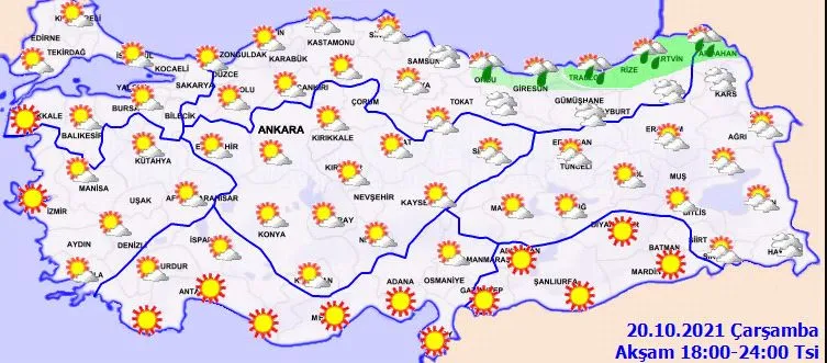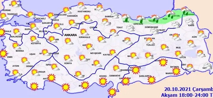 Meteoroloji Genel Müdürlüğü tarafından yapılan son değerlendirmelere göre, Ülkemizin kuzeydoğu kesimlerinin parçalı ve yer yer çok bulutlu, bu akşam saatlerinde Doğu Karadeniz kıyıları ile Ordu ve Ardahan çevrelerinin sağanak yağışlı, diğer yerlerin az bulutlu ve açık geçeceği tahmin ediliyor. Gece ve Perşembe sabah saatlerinde Marmara, İç Ege, İç Anadolu’nun kuzeydoğusu, Karadeniz’in iç kesimleri ile Doğu Anadolu’nun kuzeyinde yer yer pus ve sis bekleniyor.