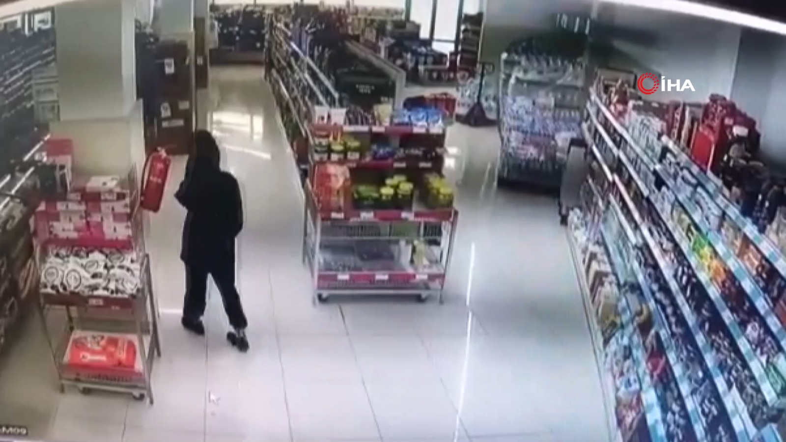 Bursa’nın merkez Osmangazi ilçesi Güneştepe mahallesinde bulunan markete gelen bir müşteri, raflara baktığı sırada duvarda asılı olan yangın tüpüne çarptı. Yere düşen yangın tüpünün emniyet kilidi açılınca dolu olan yangın tüpünün içindeki kimyasal toz marketi dumana boğdu. Market içinde alışveriş yapan diğer müşteriler panikle kendini dışarı attı. Bu garip anlar ise marketin güvenlik kameraları tarafından saniye saniye kaydedildi.