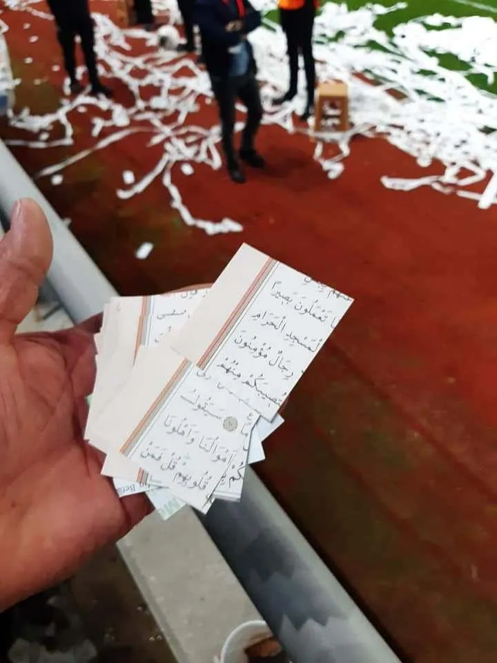 Maça giden bir vatandaşın sosyal medya hesabında paylaştığı görüntülerde binlerce Kur’an-ı Kerim ayetlerini içeren sayfalarının parça parça kesilerek yerlerden toplandığı görüldü.