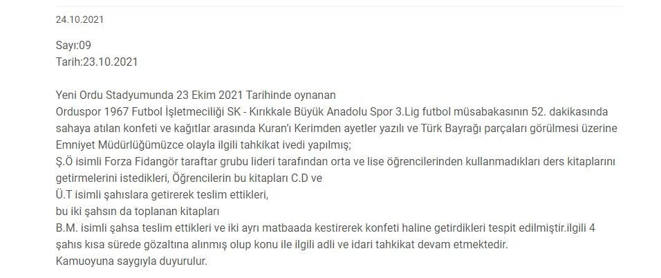 Valilikten yapılan açıklamada “Yeni Ordu Stadyumunda 23 Ekim 2021 Tarihinde oynanan Orduspor 1967 Futbol İşletmeciliği SK – Kırıkkale Büyük Anadolu Spor 3.Lig futbol müsabakasının 52. dakikasında sahaya atılan konfeti ve kağıtlar arasında Kuran’ı Kerimden ayetler yazılı ve Türk Bayrağı parçaları görülmesi üzerine Emniyet Müdürlüğümüzce olayla ilgili tahkikat ivedi yapılmış; Ş.Ö isimli Forza Fidangör taraftar grubu lideri tarafından orta ve lise öğrencilerinden kullanmadıkları ders kitaplarını getirmelerini istedikleri, Öğrencilerin bu kitapları C.D ve Ü.T isimli şahıslara getirerek teslim ettikleri, bu iki şahsın da toplanan kitapları B.M. isimli şahsa teslim ettikleri ve iki ayrı matbaada kestirerek konfeti haline getirdikleri tespit edilmiştir. İlgili 4 şahıs kısa sürede gözaltına alınmış olup konu ile ilgili adli ve idari tahkikat devam etmektedir. Kamuoyuna saygıyla duyurulur.” denildi.