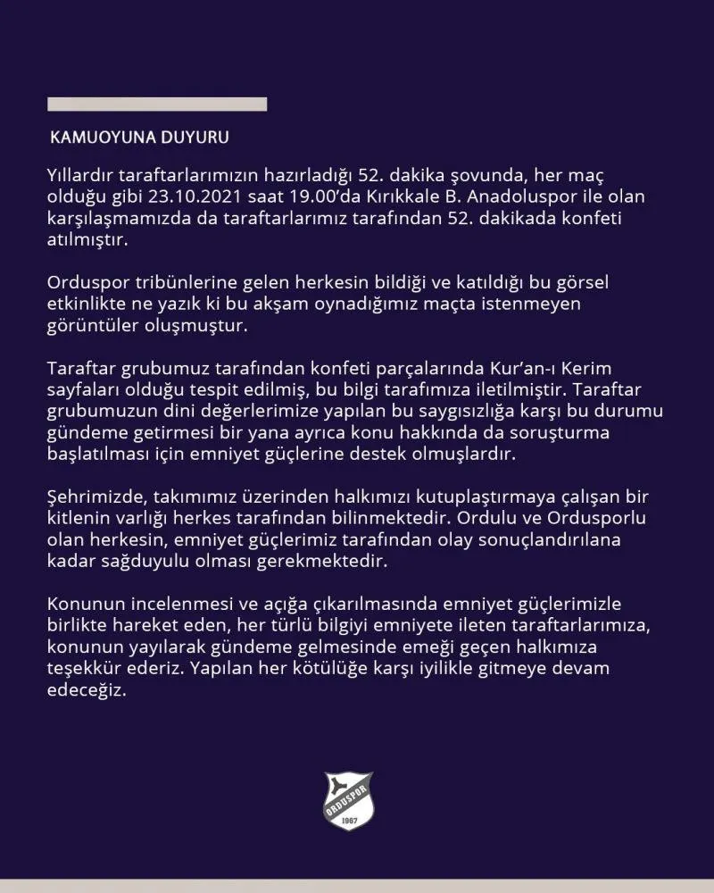 “Maçın 52. dakikasında konfeti atılmıştır. Orduspor tribünlerinden gelen herkesin bildiği ve katıldığı bu görsel etkinlikte ne yazık ki bu akşam oynadığımız maçta istenmeyen görüntüler oluşmuştur. Taraftar grubumuz tarafından konfeti parçalarında Kuran-ı Kerim sayfaları olduğu tespit edilmiş, bu bilgi tarafımıza iletilmiştir. Taraftar grubumuzun dini değerlerimize yapılan bu saygısızlığa karşı bu durumu gündeme getirmesi bir yana ayrıca konu hakkında da soruşturma başlatılması için emniyet güçlerine destek olmuşlardır.”