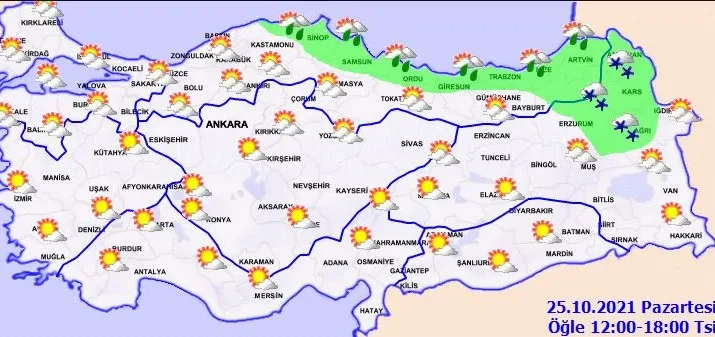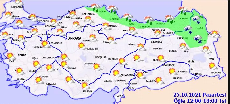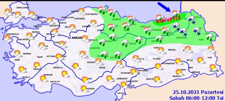 Meteoroloji Genel Müdürlüğü tarafından yapılan son değerlendirmelere göre: Ülkemizin kuzey ve iç kesimlerinin parçalı ve yer yer çok bulutlu, İç Anadolu’nun kuzeydoğusu, Doğu Anadolu’nun kuzeyi, Orta ve Doğu Karadeniz ile Sinop çevreleri ve Kastamonu’nun kuzey ve doğu kesimlerinin yağışlı geçeceği tahmin ediliyor. Genellikle yağmur ve sağanak Karadeniz kıyılarında yer yer gök gürültülü sağanak, Doğu Karadeniz’in yüksek kesimleri ile Doğu Anadolu’nun kuzeydoğusunda karla karışık yağmur ve yer yer kar yağışı şeklinde görülmesi beklenen yağışların; Doğu Karadeniz kıyılarında yerel olarak kuvvetli ve çok kuvvetli, Rize çevreleri ve Artvin’in kuzey kesimlerinde çok kuvvetli ve yer yer şiddetli olması bekleniyor.