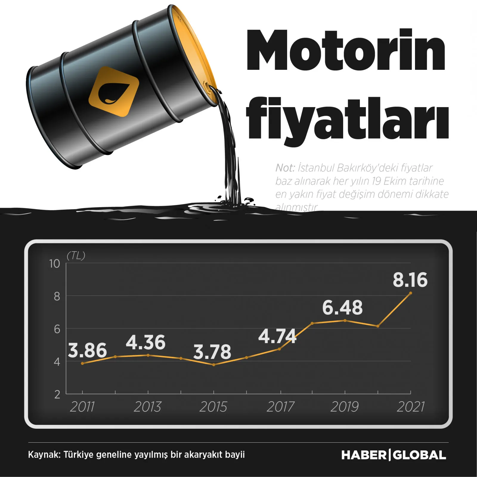 20 Mayıs 2021 tarihi itibarıyla 95 oktan kurşunsuz benzinin litre fiyatı üzerinden ÖTV tutarı toplamda 1.3313 TL, 98 oktan kurşunsuz benzinin litre fiyatı üzerinden ise 1.5836 TL ÖTV alınıyor. Bir litre motorin üzerinden ise 1.2931 TL vergi alınmakta. 98 oktan kurşunsuz benzinin litresinden alınan ÖTV ise motorinin ÖTV’si arasında 290 kuruş fark var.