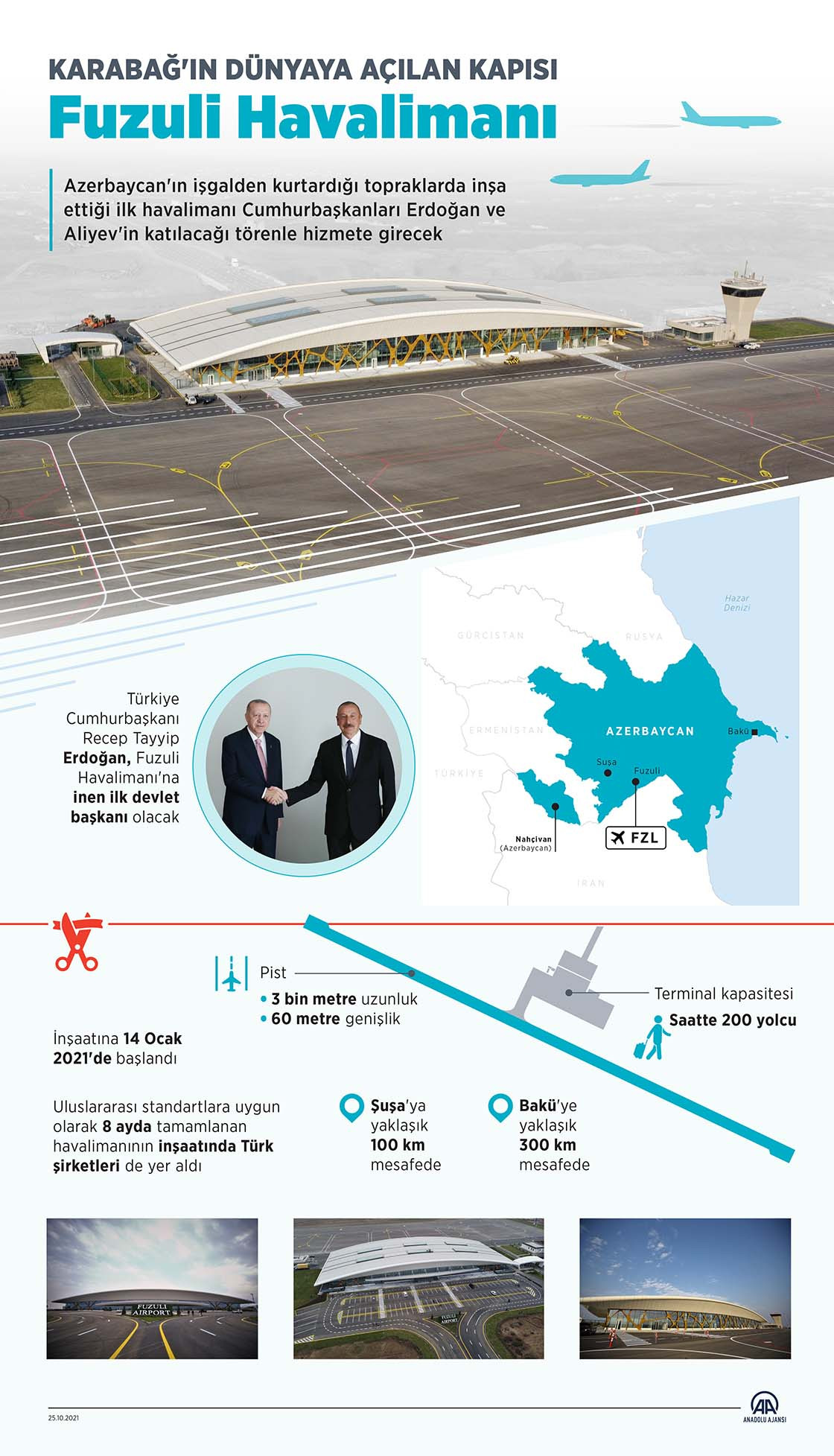 Temeli 14 Ocak 2021’de Cumhurbaşkanı Aliyev tarafından atılan Füzuli Havalimanı en yüksek uluslararası standartlara uygun olarak 8 ayda uçakları kabul edecek hale geldi. Havalimanına ilk test uçuşu 22 Ağustos’ta gerçekleştirildi.